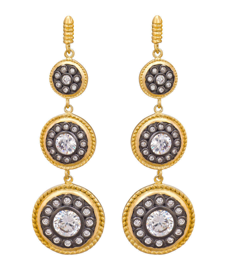 These triple disk drop earrings from Belargo pack a powerful fashion punch. The design is full of personality and radiates with a special quality that you'll love. How could you resist a design that includes three levels of cubic zirconia covered disks? These earrings are post back closure for pierced ears.