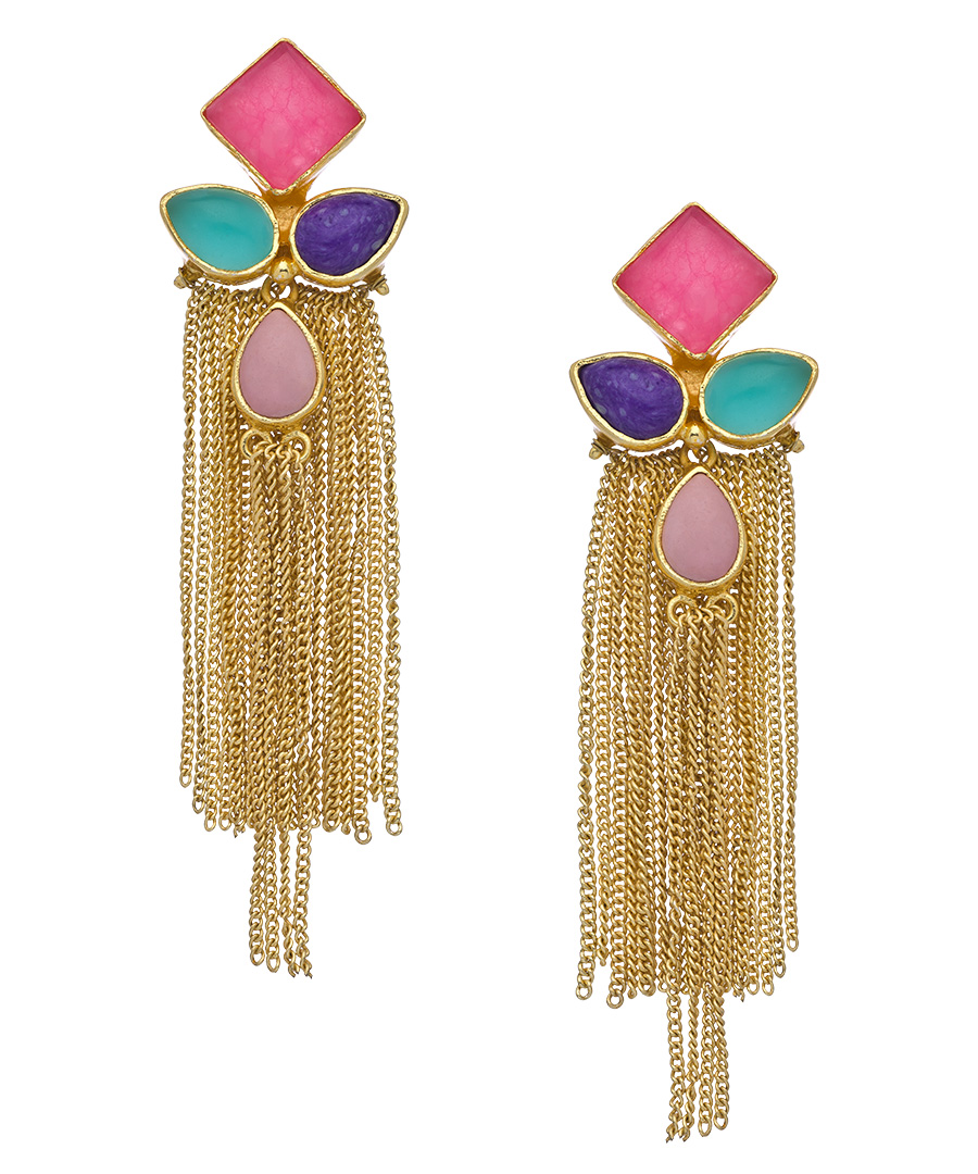 Elegant and luxurious, with the long, silky drape of chains accented by brightly colored stones, these Belsi gold Bela chandelier earrings invite you to unleash your inner free spirit. These lovely earrings accessorize everything from dressy daytime looks to a glamorous evening ensemble. Earrings fasten with a post closure for pierced ears.