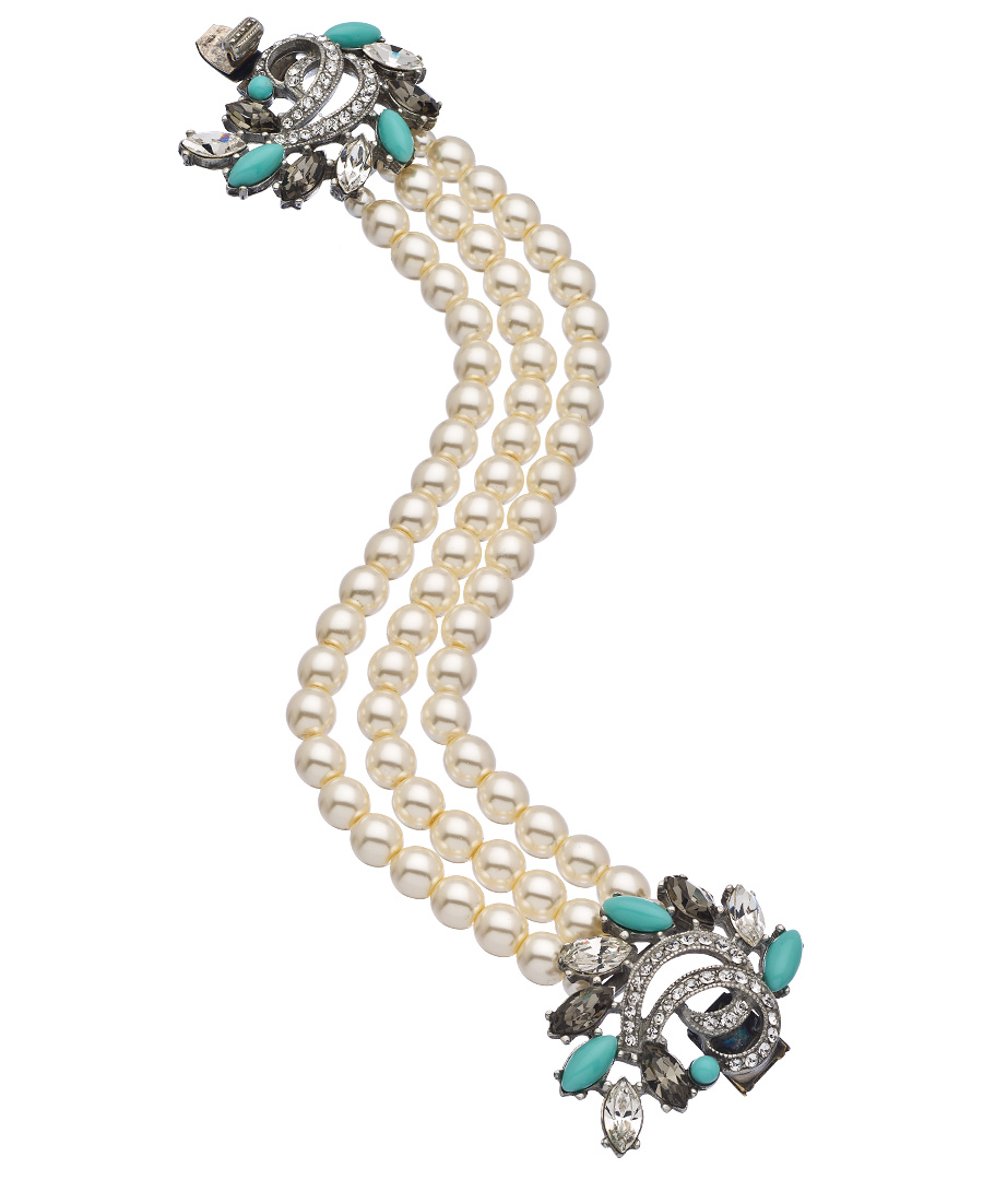 Ben-Amun scores a win with this silver, crystal, turquoise and pearl deco cluster bracelet. The luxury of pearls has been appreciated for thousands of years, and it's easy to see why: their gleam and luster are unsurpassed. Bracelet fastens with a box tab closure.