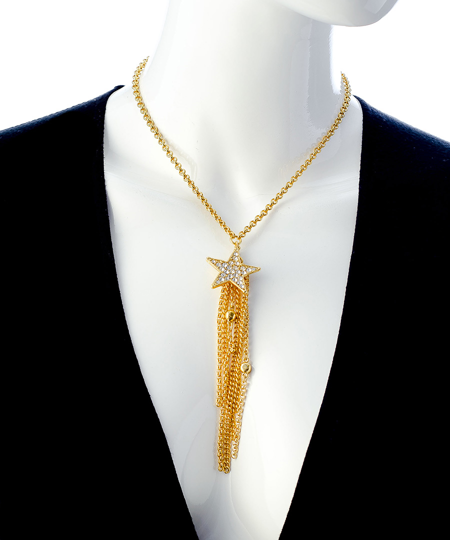 Wear an icon, be an icon. A 1 inch star shines bright with 25 Swarovski clear crystals. Cluster of 6 metal chain fringe strings hang from star and sway delicately to and fro wherever you go. Star hangs on an 18 inch adjustable rolo chain.