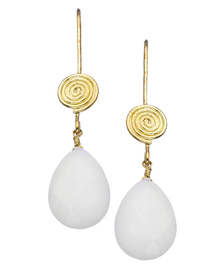 Betty Carre has a knack for pairing beautiful materials, and these gold spiral and white agate teardrop earrings definitely meet the criteria. Exquisite white agate teardrop stones are faceted and suspended from gold spirals attached to the french wire closure for pierced ears. These earrings will complete your favorite looks.