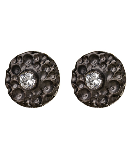 These jeweled glistening suds stud earrings from Bita Pourtavoosi are smoldering hot. The dark earrings are gun metal plated and accented with a round cut, bezel set white cubic zirconia stone. This earring fastens with a sterling silver post back closure for pierced ears.