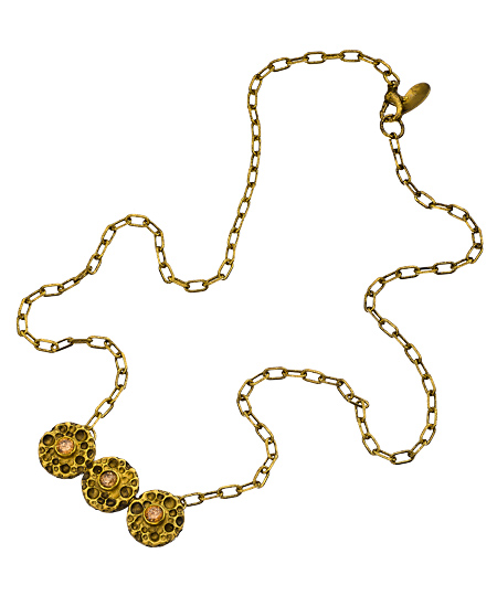 For something really distinctive try the jeweled triple glistening suds necklace from Bita Pourtavoosi. Three disks are linked together in the suds design which also showcases some fabulous champagne bezel set cubic zirconia. The necklace fastens with a lobster claw closure.