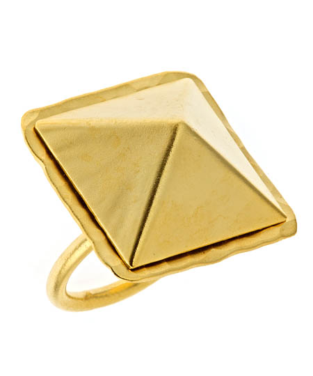 Be prepared to fall in love with this pyramid ring in yellow gold by Bita Pourtavoosi. The 24k yellow gold platedring is simply stunning in this color. The large pyramid that rests on top of the ring is the focal point because of its sleek attractive nature.