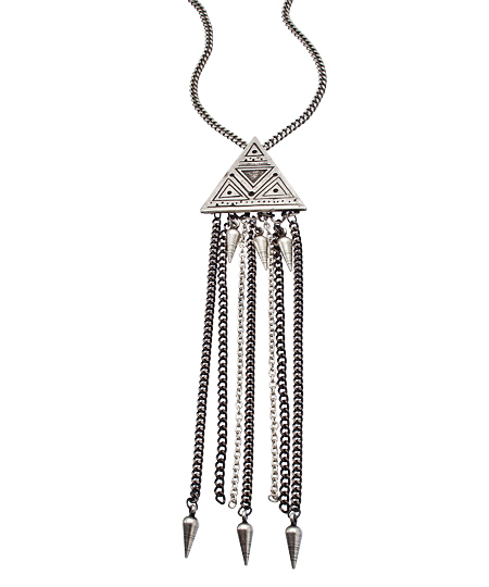extraordinary. The antique silver necklace features a pyramid motif with ancient Egyptian carvings and mixed-metal chain spiked fringes. It's a uniquely glamorous piece that's a cut above the