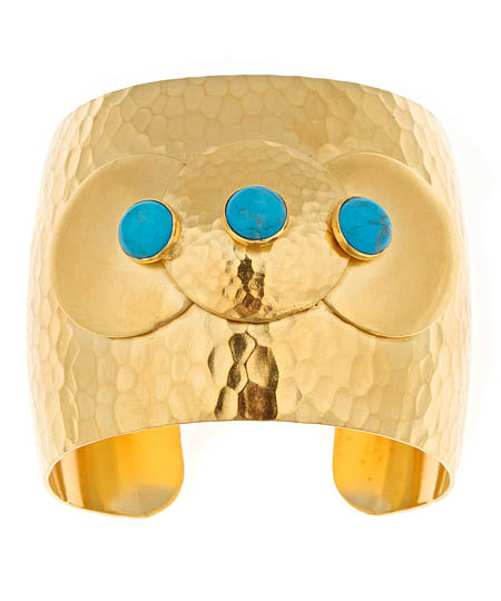 The Bita Pourtavoosi turquoise howlite cosmic cuff is an essential everyday piece that is effortlessly chic. This gorgeous cuff is crafted in a glowing combination of hammered 24k yellow-gold plate and turquoise howlite stones.