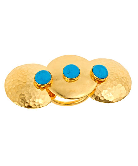 The Bita Pourtavoosi turquoise howlite and hematite cosmic double ring plays with proportions. The wide overlapping disc details include a polished disc framed by two hammered discs. The three round stones pop against the 24k yellow-gold plate.