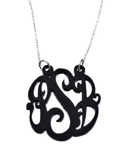 Slip on this elegant black acrylic script cutout 1 1/2 inch monogram necklace for a personal touch. Initials are carved out on a black acrylic pendant and hangs from your choice of a 16 or 18-inch sterling silver, rose gold, or gold vermeil split chain. It's a great everyday accessory.