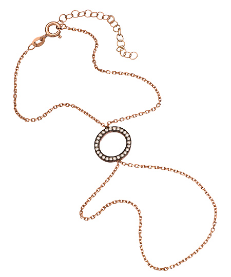 A beautiful, crystal studded rose gold circle is the star of this Blee Inara crystal circle and rose gold harem bracelet. Encompassing the entire hand, the delicate chains and exquisite charm are a sophisticated finishing touch. Bracelet fastens with a spring clasp.