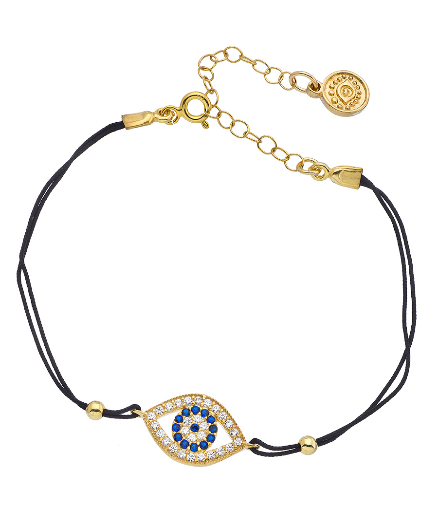 This Blee Inara crystal evil eye string bracelet features round white and blue Swarovski crystals set in a sparkling, mesmerizing, gold evil eye design on a double stranded black cord. Available in your choice of gold or silver, please specify metal color when ordering. Bracelet fastens with a spring clasp.