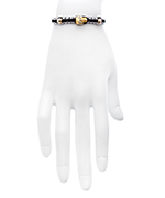 This gold, crystal and macrame with skull charm bracelet from Blee Inara is engaging and innovative. Available in brown or black, the bright gold skull is adorned with crystal eyes and placed on the expertly crafted macrame bracelet, which features an adjustable sliding clasp closure.
