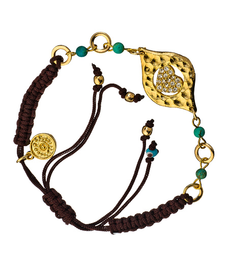 Spice things up a bit with the Swarovski Eye and turquoise macrame bracelet from Blee Inara. The bracelet is wonderfully crafted with a style that's natural sleek. The Swarovski crystals and small turquoise beads are fine accents to the fashionable piece.