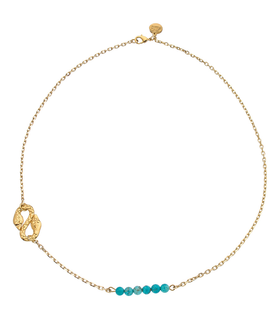 This sweet Blee Inara turquoise and gold infinity snake necklace features a gold snake charm, curled in an infinity symbol. The necklace is further adorned with a row of round turquoise beads. The perfect finishing touch for everything from casual outfits to business wear is right here. Necklace fastens with a lobster claw clasp.