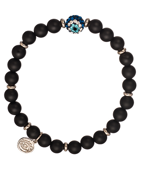 Smooth, jet black, volcanic rock beads are adorned with silver spacer beads and a hypnotic, crystal encrusted evil eye in this Blee Inara volcano rock and evil eye stretch bracelet. Sleek sophistication paired with the protective quality of the evil eye: a powerful and gorgeous combination. Bracelet stretches for the perfect fit.