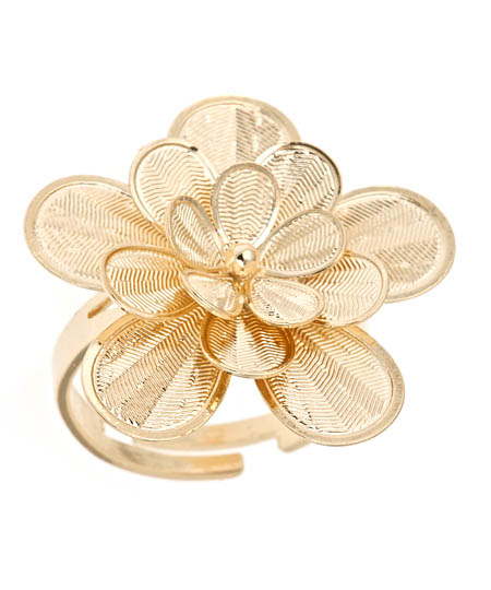 This blooming flower ring will brighten your day every time you glance down at your hand. The pretty petals are crafted of textured 18k gold plate. This girly ring is the perfect accent piece for this season’s feminine looks. The polished band is adjustable, allowing you to perfect the fit.