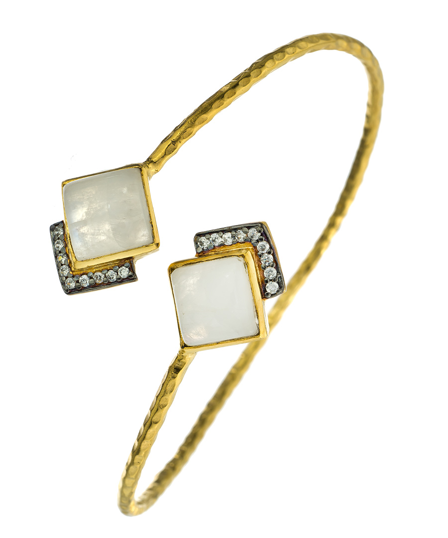 Drape your wrist in this Blossom Box Jewelry gold, CZ and double square moonstone bangle bracelet. Hypnotically lovely moonstones are embellished with rows of CZ stones on two sides of the squares. Bracelet is adjustable for the perfect fit.