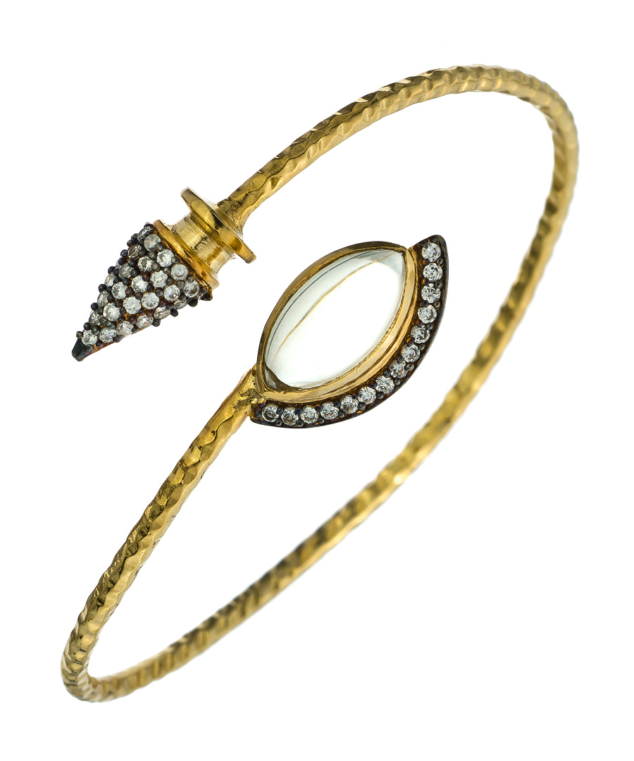 A cone shape is completely enrobed in CZ stones and is accompanied by a hypnotic lemon quartz stone, in this Blossom Box Jewelry gold, CZ and lemon quartz bangle bracelet. The lemon quartz stone is surrounded by twinkling CZs as well. This bracelet is stackable and adjustable for the perfect fit.