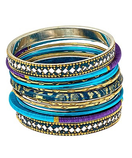 Blu Bijoux blue mixed media stackable bangle bracelets are a perfect shabby chic look for any time of year. Crafted from various materials such as multicolor thread and a gorgeous lucite pattern, this set of 15 bangles also feature gold plated and mirrored textures.