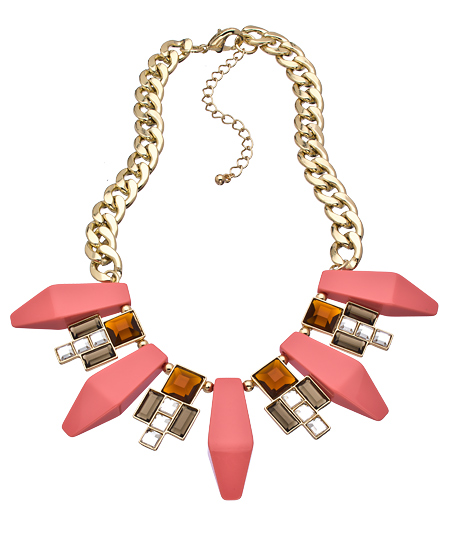 Want to be striking? It's easy with the coral art deco bib necklace from Blu Bijoux. It features a geometric bib of Austrian crystals on a bold gold-plated chain. Style this edgy neckpiece with favorite tees or little black dresses!