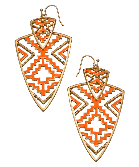 Show your true colors with these Native American inspired arrowhead earrings from Blu Bijoux. They feature a large and a small arrowhead in coral colored enamel and gold. This fetching design will go with everything from casual to formal wear. Earrings have french wire closures.