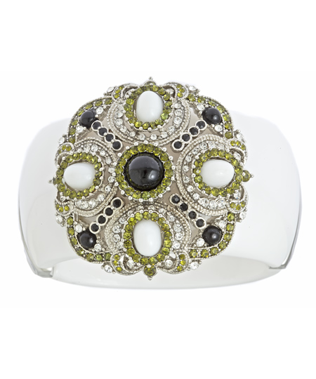 Blu Bijouz crystal pendant cuff is gorgeous. White and green austrian crystals absolutely sparkle as they cover the silver plated pendant at the front of this magnificent white resin cuff. Black and white resin stones provide the pendant with an even more luxurious look. The cuff is hinged and fastens with a magnetic closure. This bracelet sits 1 1/2 inches wide on your wrist with an interior measurement of 1 1/2 inches wide by 2 1/2 inches tall.