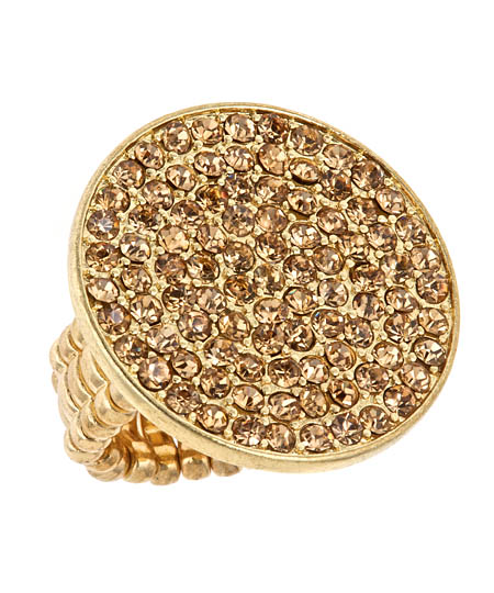 The Blu Bijoux flat crystal pave goldtone ring has a feminine, yet modern design. The yellow Austrian crystals are beautifully showcased against the gold-plate disc. The comfortable band stretches to fit most fingers.