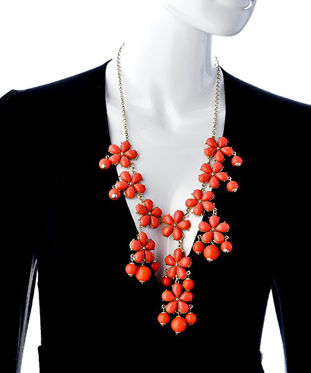 Make a dramatic statement with this Blu Bijoux gold and coral flower large bib necklace. Seven flowers provide the top layer, and support the dangling layers. In the center, a large flower adorned with round bubbles finishes the look. Necklace fastens with a lobster claw clasp.