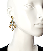 For the fashion forward, Blu Bijoux submits for your approval these gold and grey-green chandelier earrings. The Indian inspired design shows the craftsmanship at its best, with gold filigree bezels and rich, faceted stones. Earrings have a post closure for pierced ears.