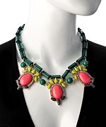 Blu Bijoux presents this green and multicolor crystals deco bib necklace, featuring tube beads of green circling your neck and providing the foundation for the colorful, masterfully designed bib. Large coral stones are surrounded by a horseshoe of clear crystals and accents of purple, yellow and light green stones. Necklace features a generous extender and fastens with a lobster claw clasp.
