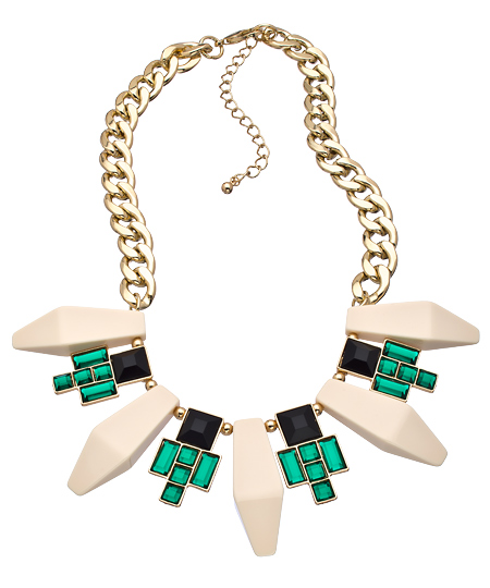 Your style dances to the beat of its own drum, so express yourself with this amazing ivory art deco bib necklace from Blu Bijoux. Black and emerald Austrian crystals highlight an ivory bib stationed on a bold gold chain. Wear jewelry that sets the rhythm.