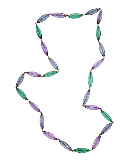 This Blu Bijoux jewel beaded necklace features variously colored beads, creating a dazzling piece. Blue, purple, and green faceted beads come together in this piece, providing for a subtle but colorful look. The necklace can be worn at its full length, or can be layered for a multidimensional look.