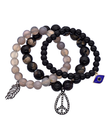 All dressed up in black and white... and this incredible Blu Bijoux set of three black and grey beaded stretch charm bracelets. One charm graces each of the three bracelets, a gunmetal and crystal peace sign, an antique silver leaf and a gold and enamel evil eye. The stretchable set is easy to wear, and each bracelet also stands alone as a great piece of jewelry.