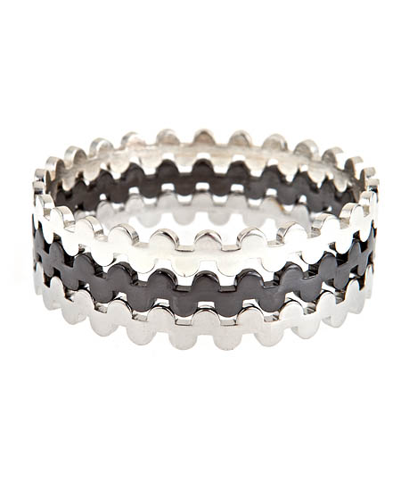 Match this silver and gunmetal puzzle bangle set by Blu Bijoux with any outfit for a stunning and memorable look. The set of three bangles is elegantly crafted with a creative design that allows the silver plated and gunmetal bangles to fit together with smooth harmony.