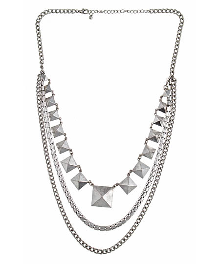 This silver pyramid necklace by Blu Bijoux is full of sophistication and style. The chic necklace features a number of pyramid shapes that adorn this piece. Dropping below the pyramids are two equally enchanting silver plated chains.