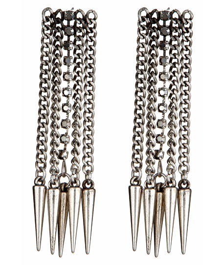These spike earrings by Blu Bijoux are to die for. The silver plated earrings let four chains dangle from them. In the middle of the four chains is a fifth chain made of black Austrian crystals.
