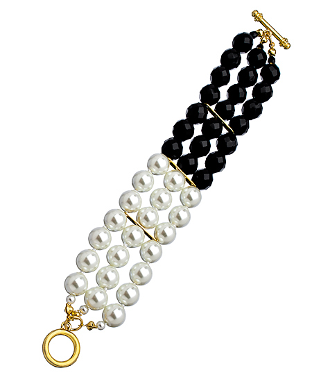 Ebony and ivory come together in perfect harmony with Boyer New York's yin yang bracelet. The bracelet exudes sheer elegance with a combination of faceted jet beads mirroring a triple strand of elegant white pearls. And this gorgeous accessory includes a gold toggle closure for easy slip-on style.