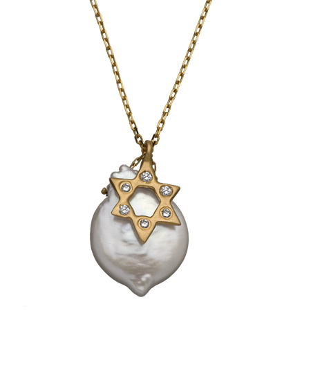 Carolina Pearl Necklace with Star is a pretty piece. Authentic coin pearl with 14k gold charm with diamonds on a 16" 14k gold chain. pearl is 3/4" in diameter.