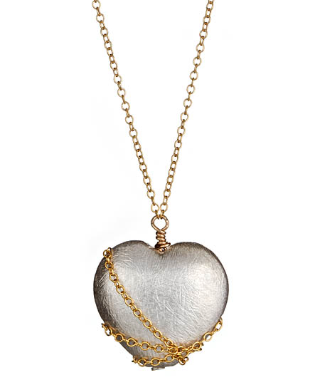 Dress your neck with this wrapped heart pendant necklace by Carrie Saxl. This piece represents a tangled love with the 14k gold filled chain draped across the beautiful sterling silver heart pendant.