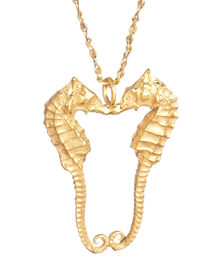 It doesn’t get any cuter than this kissing sea horse pendant necklace by Catherine Weitzman. The two small charms are each cast in 18k gold vermeil and cast from the form of a real sea horse. The short chain fastens with a lobster-claw clasp.