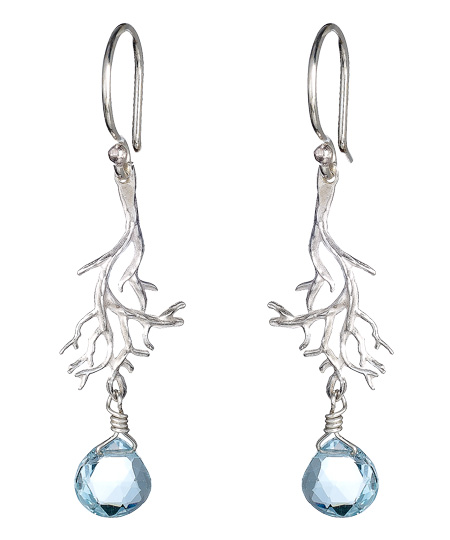 These Catherine Weitzman sea grass and topaz drop earrings capture the spirit of the sea. The cool tones of the sterling silver are beautifully complimented by a faceted Swiss blue topaz teardrop. The short ear wires are for pierced ears.