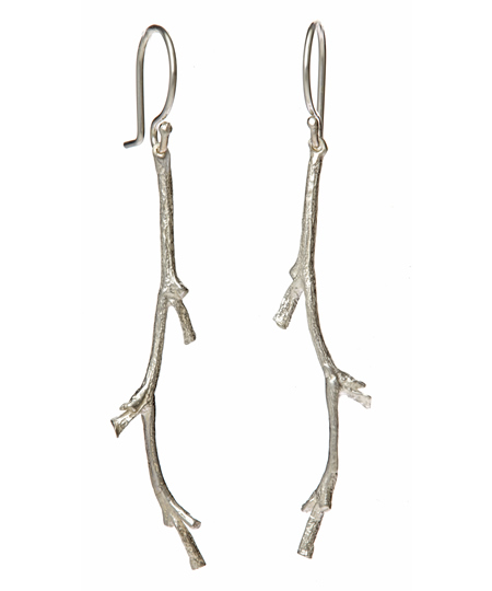 Catherine Weitzman silver branch earrings are pretty with a natural flair. Sterling silver branches feature tiny twig shoots jutting out from these slender earrings. The pair had a curved design that gives the earrings a wonderfully fluid look. These earrings dangle a total of 2 1/4 inches long from your ears. Shepherd’s hooks for pierced ears.