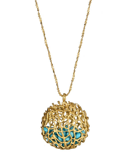 Catherine Weitzman's small basket necklace holds a wealth of colorful treasures. The expertly sculpted basket, of 18K gold vermeil, is half-full of lush turquoise, like a net just pulled from the bright waters of the Caribbean. This eye-catching necklace adds color and beauty to any look.