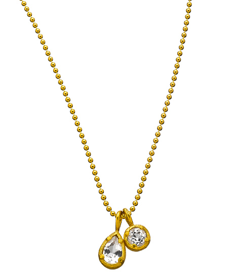It would be hard not to dazzle in this two solitaire necklace from Catherine Weitzman. The piece includes solitaires in round and tear drop shapes. This necklace fastens with a lobster claw closure.