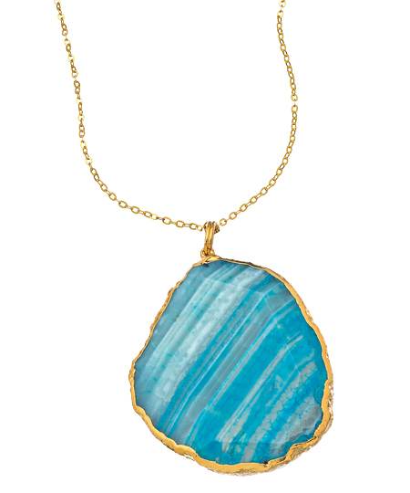 This blue agate quartz and gold pendant from Charlene K is an amazing work of art. The rich blue of the agate contrasts perfectly with the luminous gold bezel and chain, providing a look that works as well for everyday as it does for a glamorous evening out.