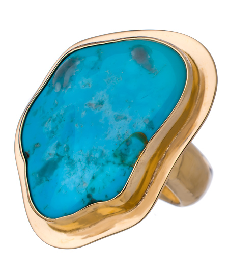 This Charles Albert gold and turquoise ring is perfect as your only accessory, and certain to quickly become one of your favorites. The freeform stone is bezel set and framed in gold, and placed on a wide gold band. This ring is sure to bring you many compliments. Ring is adjustable for the perfect fit.