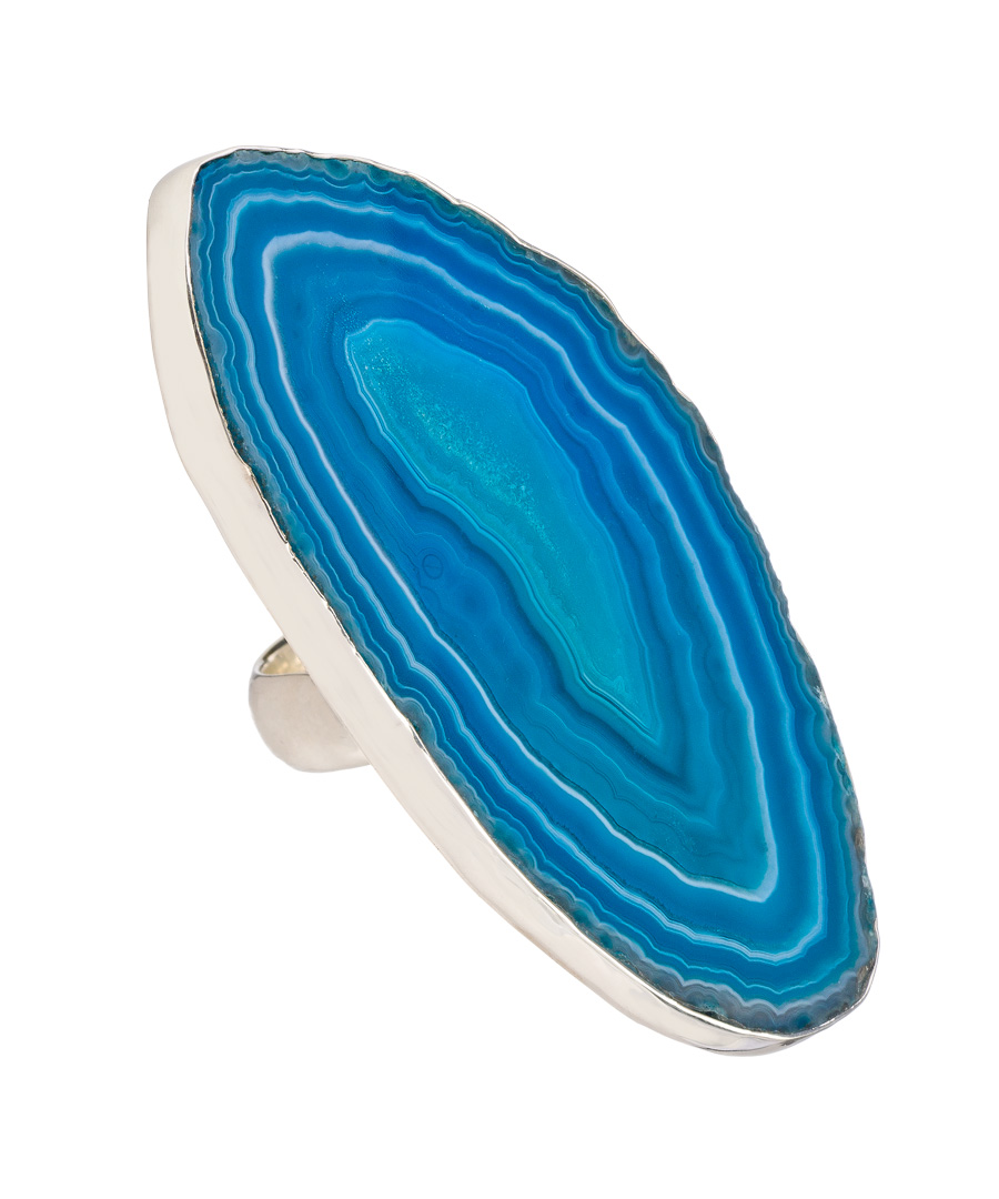 "Go big or go home" is the statement you'll be making when you sport this teal agate slice adjustable ring from Charles Albert. Set in sterling silver, the teal stone is sliced to reveal all of its special quirks. The massive ring is sure to show off your flamboyant contemporary style.