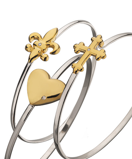 Show off your individual style with one of these three charm-detailed bracelets. Each sterling silver bracelet features your choice of a polished gold plated sideways heart, fleur-de-lis, or cross. A .15 carat diamond detail is the finishing touch on these beautiful bracelets.