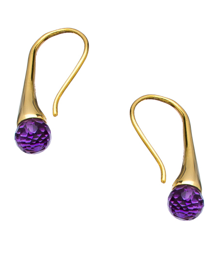 Visually seductive, the purple amethyst earrings from Charmed Circle are fabulously fashionable. The earrings are 18k gold plated and feature the faceted gemstone drop at the tip. This pair will provide impact and style to any ensemble.