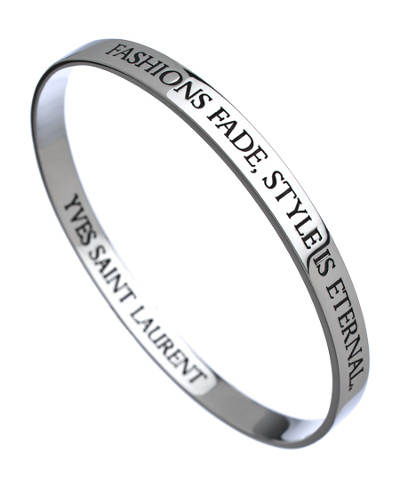 This Charmed Circle silver 'Yves Saint Laurent Quote' inspirational bangle makes a great fashion statement, literally! The sterling silver bracelet features the popular inscription 'Fashions fade, style is eternal' quoted by world famous fashion designer Yves Saint Laurent.