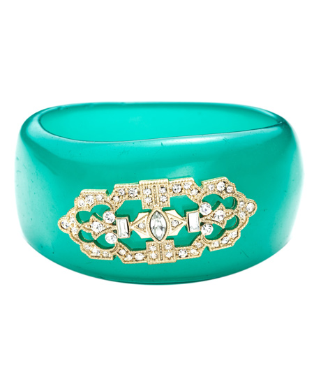 This lovely gold and green deco bangle bracelet from Danielle Stevens is finely crafted and beautifully embellished. The smooth acrylic background sets the perfect stage for the deco inspired gold design. This is a bracelet you will reach for often.